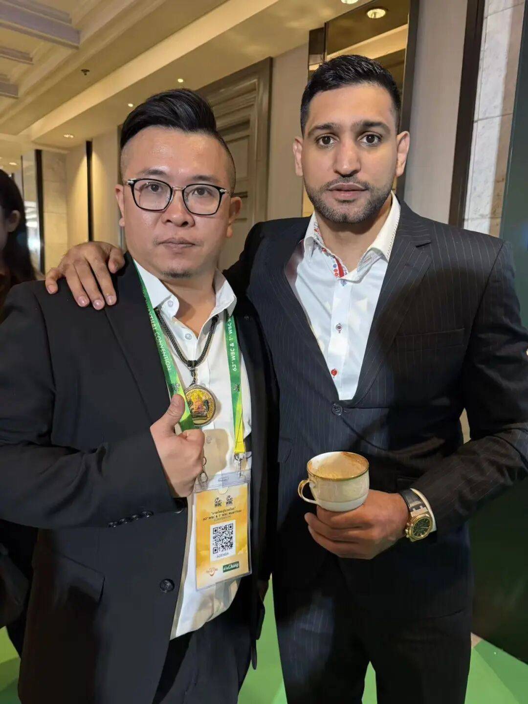 值得一提的是,在斩获双料奖项后,吴昊立即成为了年会现场的焦点东说念主物之一,各路拳坛闻东说念主纷繁与其合影迷恋,其中也包括大名鼎鼎的听说拳王阿米尔·卡汉!