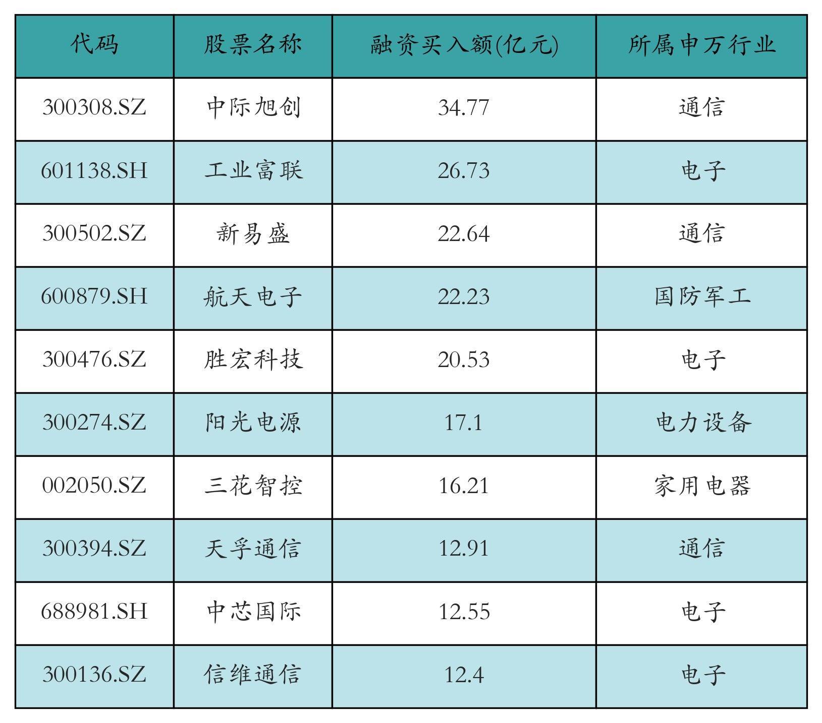 两市共有3471只个股有融资资金买入,其中中际旭创、工业富联、新易盛排行前三,买入金额分辩34.77亿元、26.73亿元、22.64亿元。融资买入额前10个股坚信见下表: