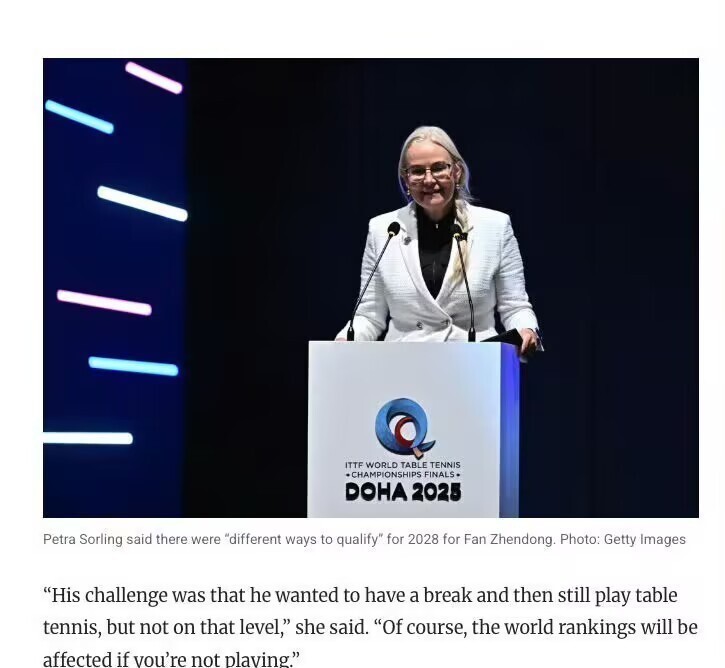 海外乒联主席索林暗示:奥运冠军樊振东若想干预2028年洛杉矶奥运会,需自愿恳求归附WTT海外赛事积分名次,粗略干预奥运会阅历赛,智商得回参赛席位。